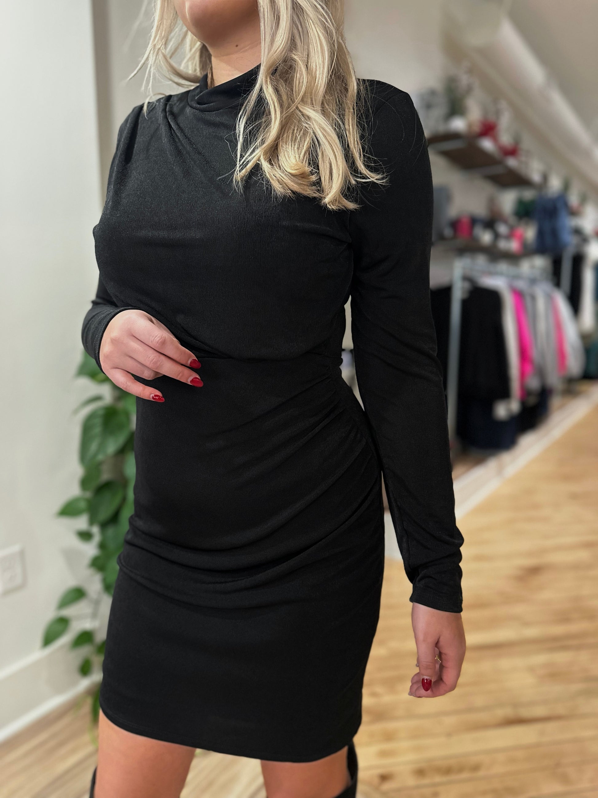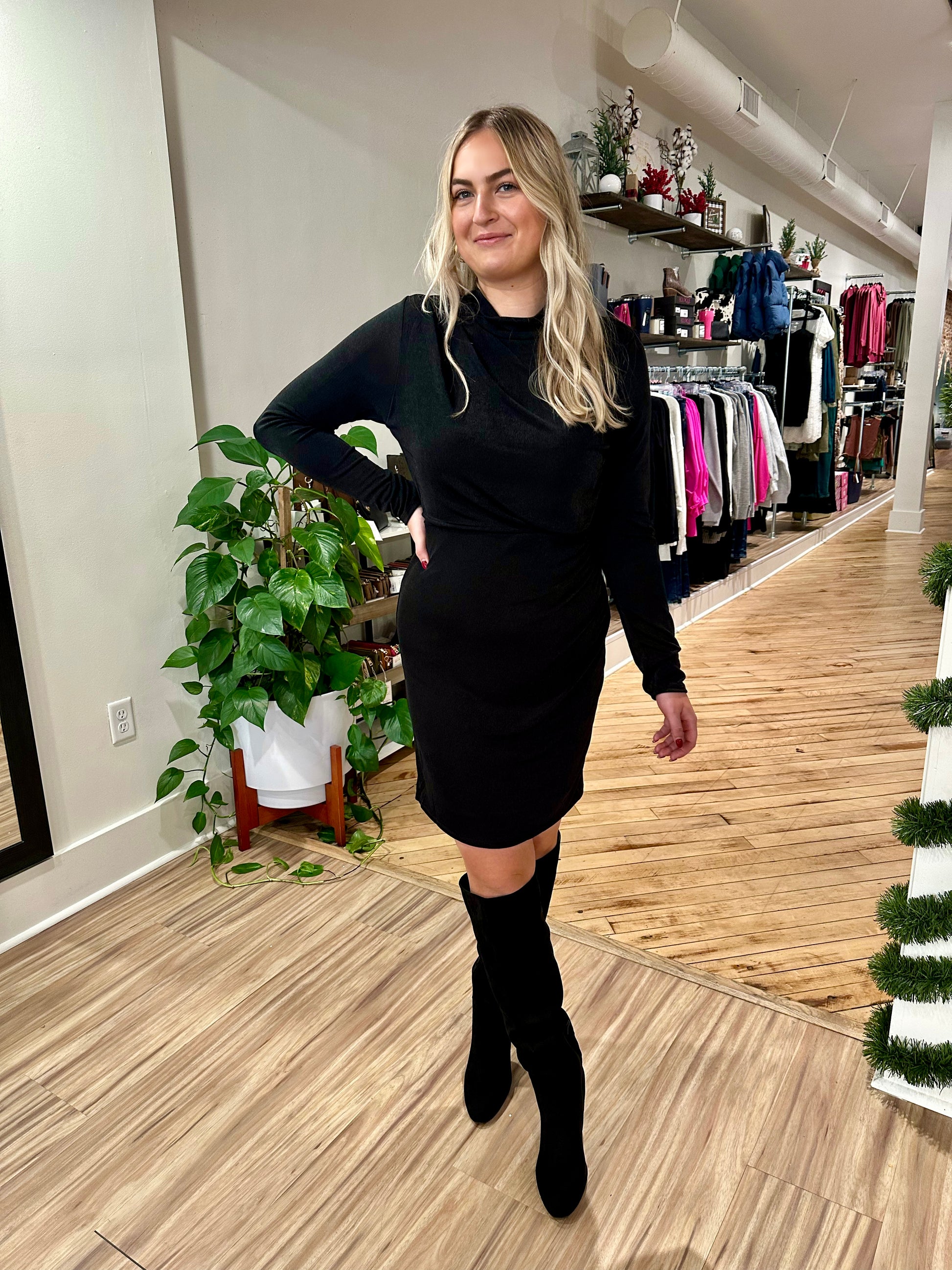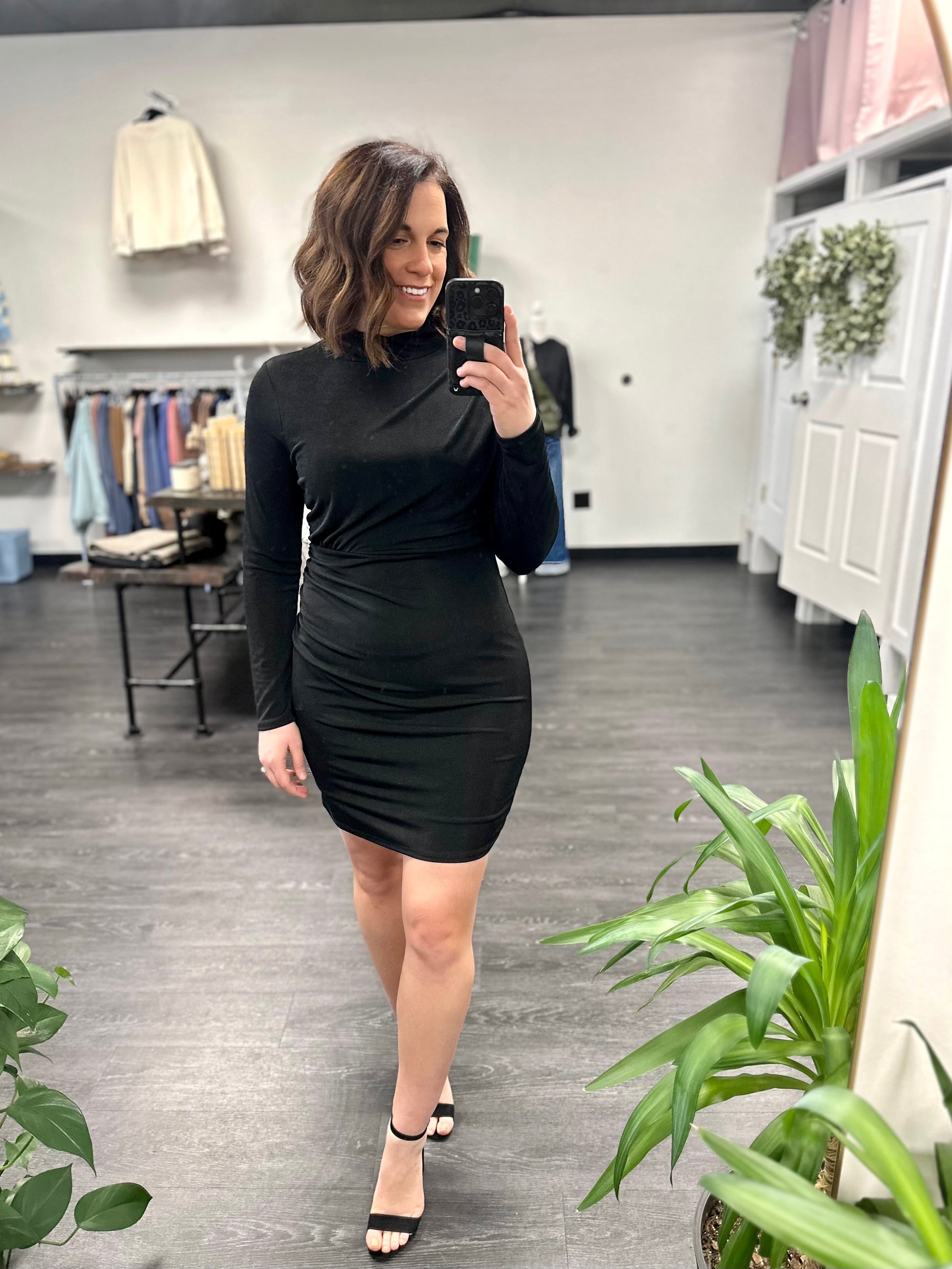 This Canterwood Shirring Dress features long sleeves and a mock neck for a classy, feminine look. The shirring design adds texture and the above the knee length offers a flattering and sophisticated silhouette. Perfect for any occasion.