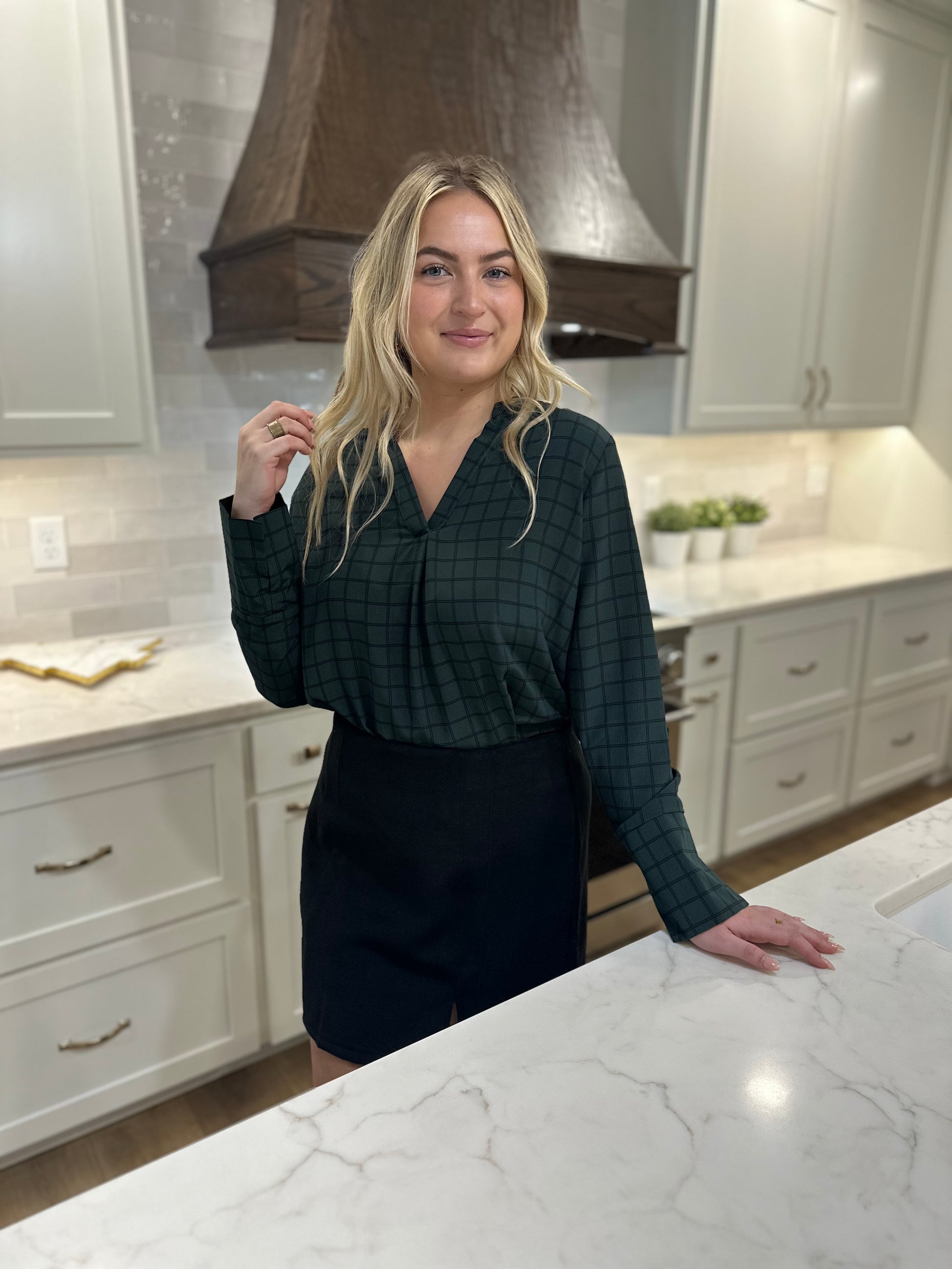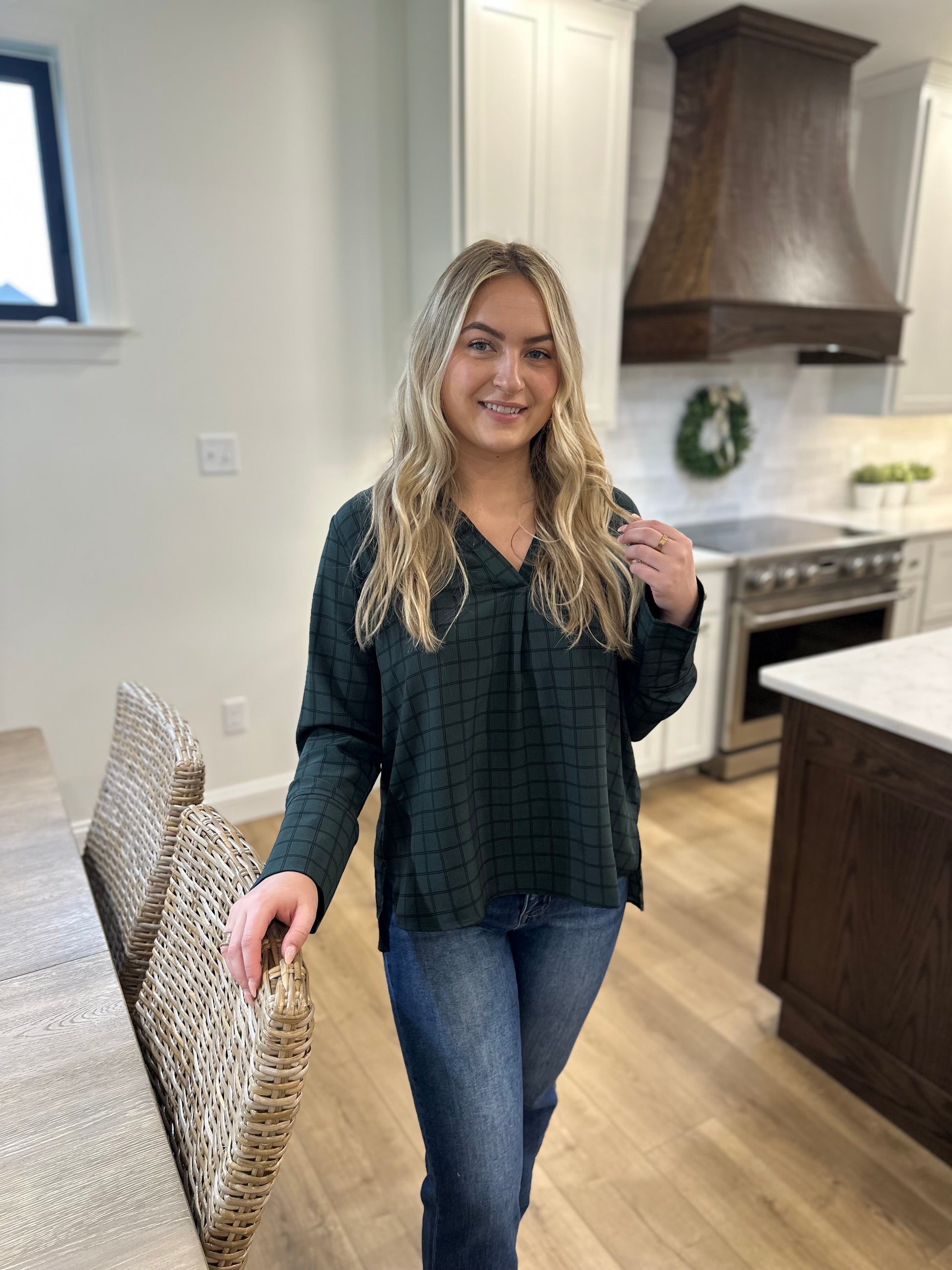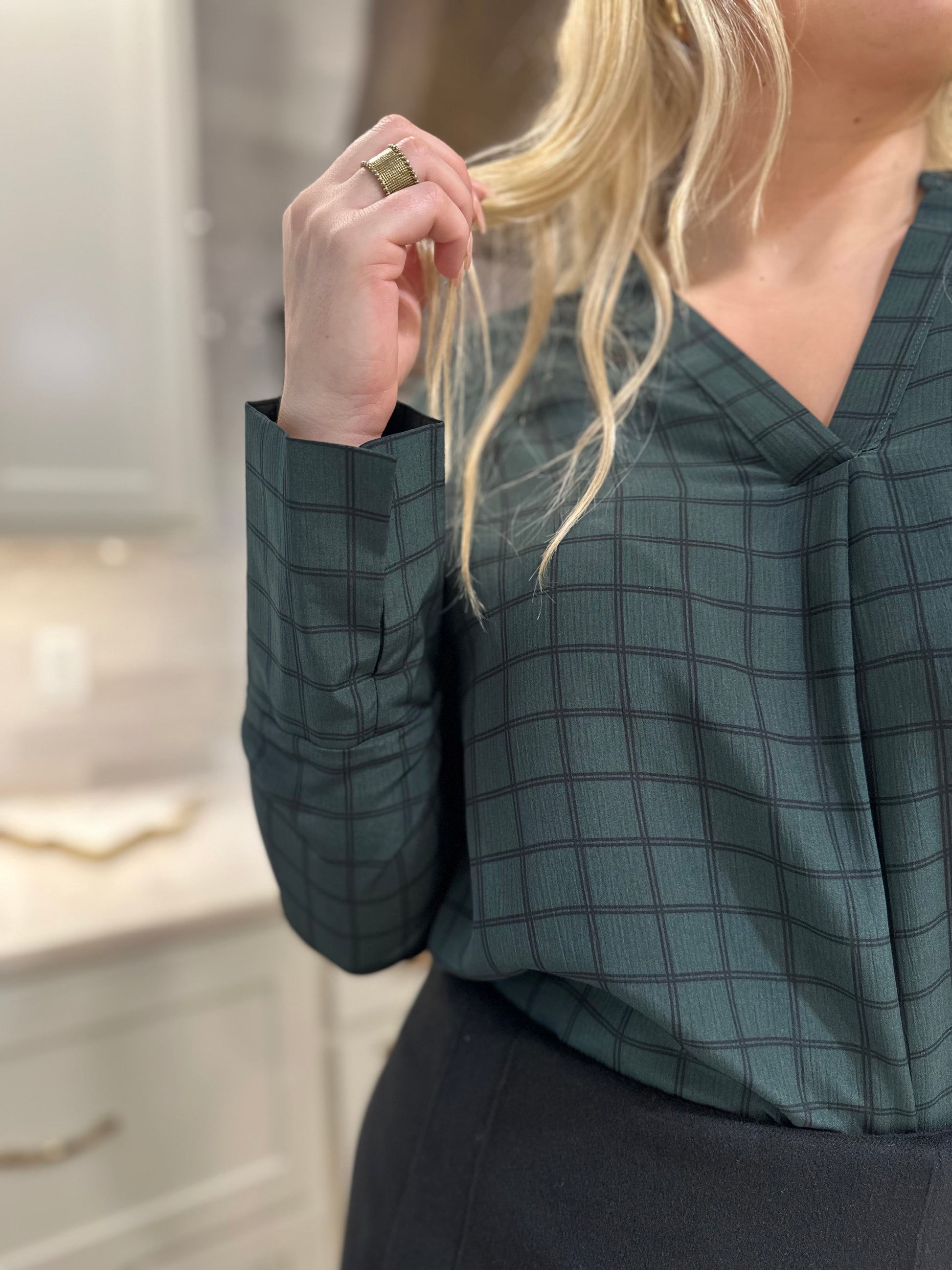 Effortless sophistication meets everyday versatility with the Darlington Grid Top. This refined piece features a classic grid pattern in a fluid, flowy fabric that moves with you throughout your day. The V-neckline and long sleeves create a polished silhouette, while the signature wide fold cuff adds an intentional design detail that elevates casual workwear. Perfect for layering or wearing solo, this top transitions seamlessly from office to weekend with understated elegance.