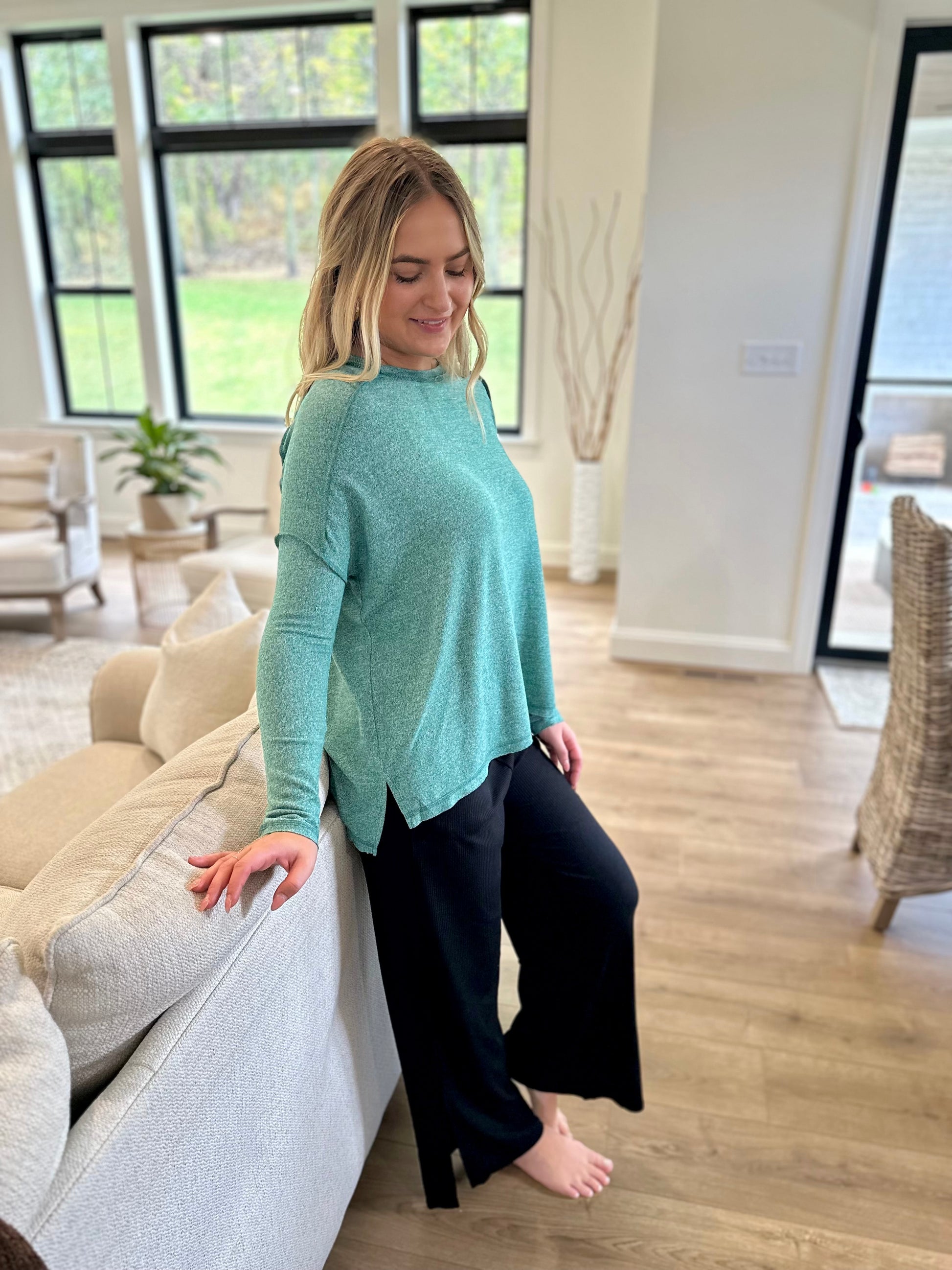 Embrace cozy vibes with the Eagle Grove Hacci Top! Featuring a soft melange fabric and breathable hacci knit, this round-neck, long-sleeve tee keeps comfort front and center. The exposed seams add a touch of playful edge, while the high-low hem with side slits offers a flattering flow and easy movement. Perfect for lounging or layering, it’s your new go-to for effortless style and softness.