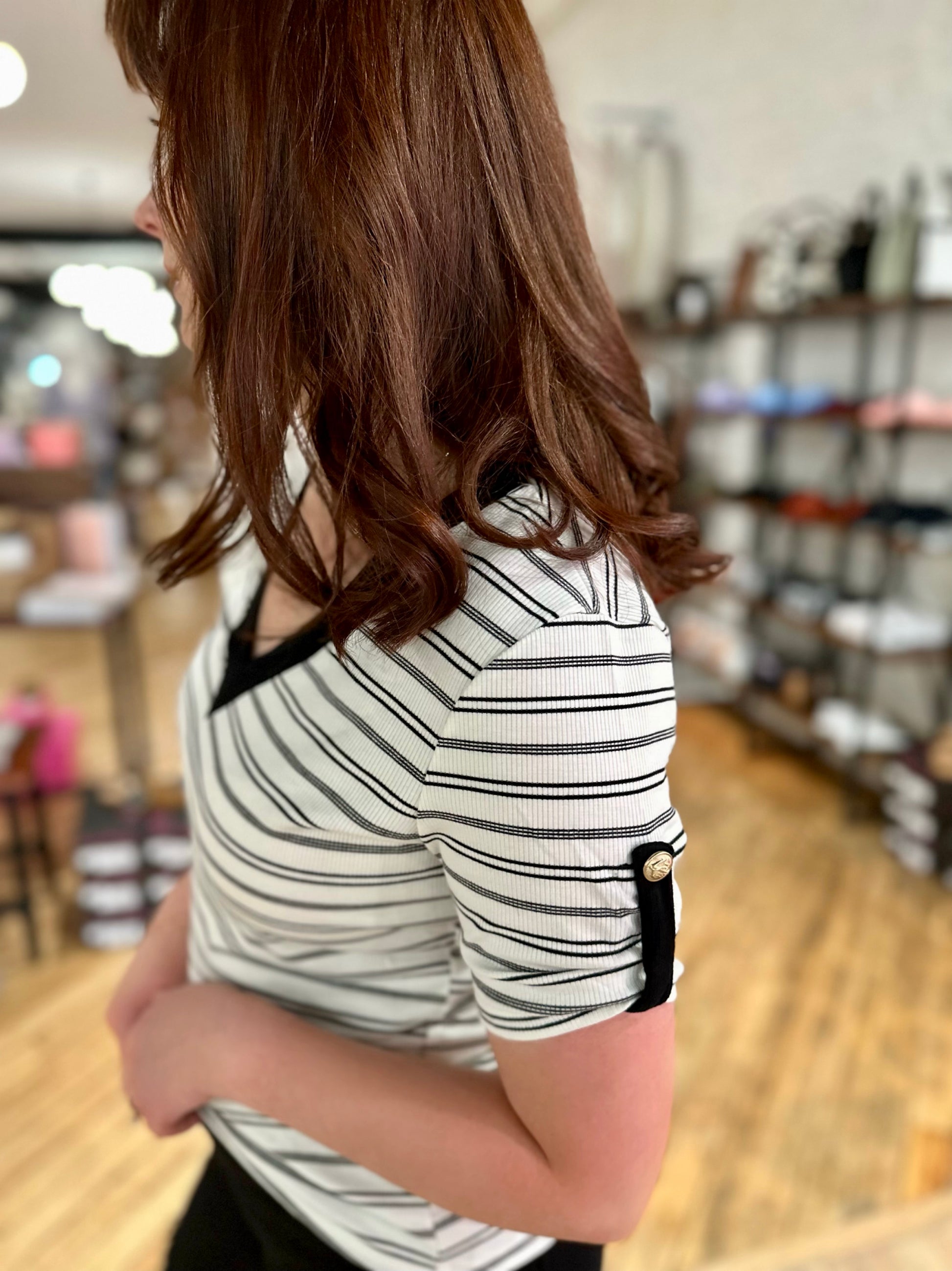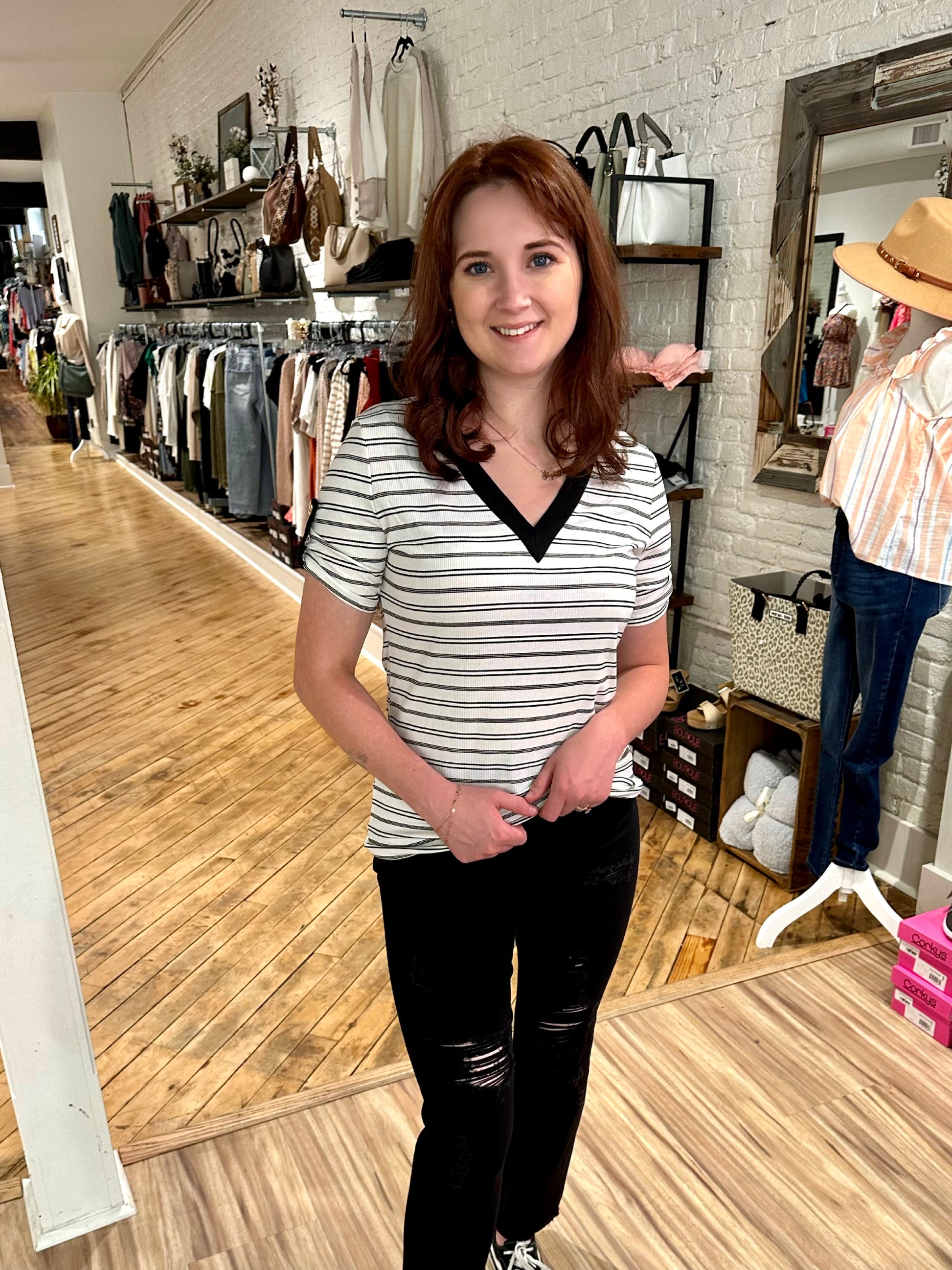 This Fresno Striped Vneck Top features a classic black striped pattern and ribbed detailing, providing a comfortable fit and a timeless, sophisticated look. The stretchy fabric offers a secure, snug fit, making it the perfect piece for a variety of occasions.
