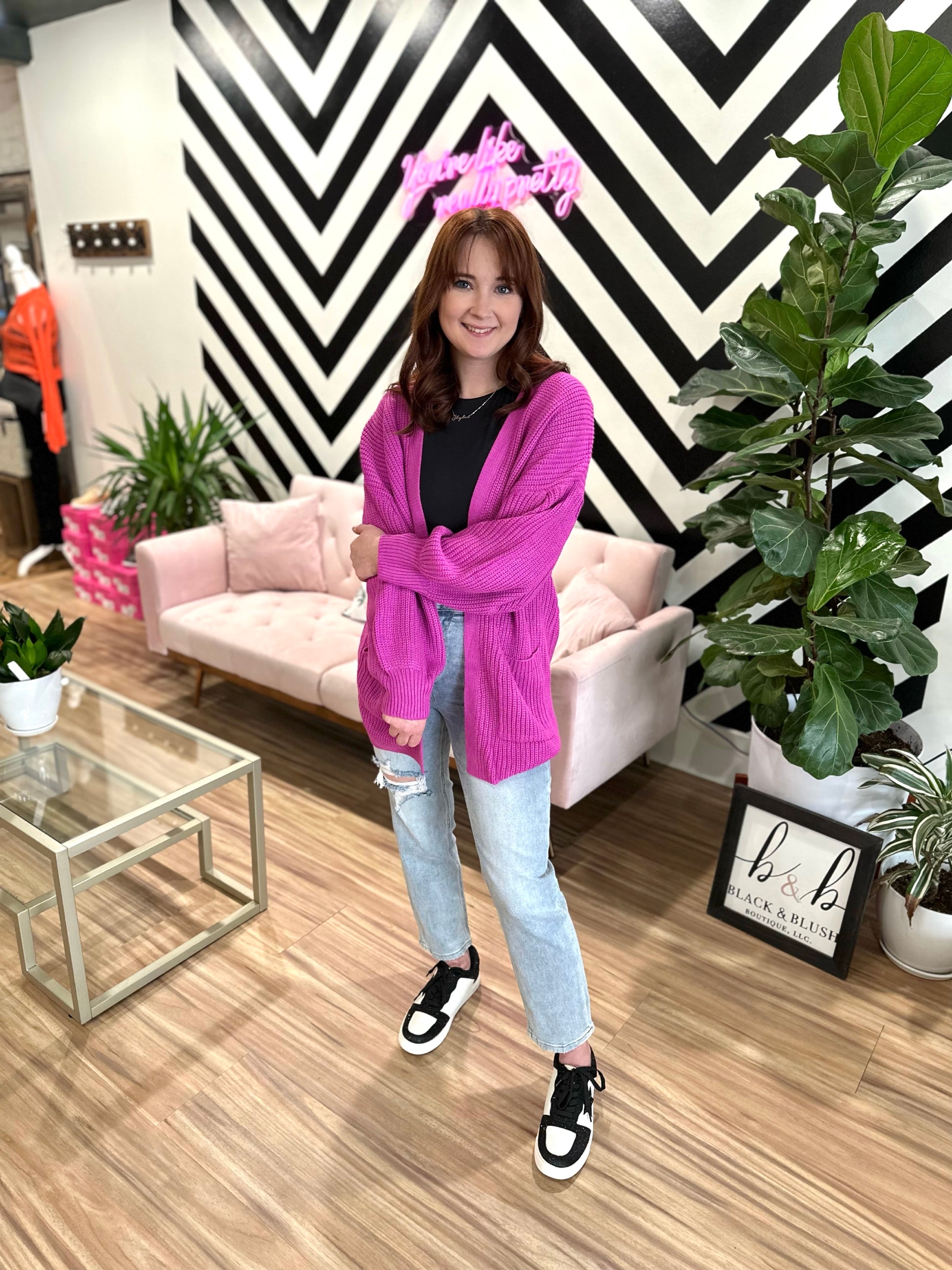Kaycee is a true size medium top, size 5, wearing the small cardigan