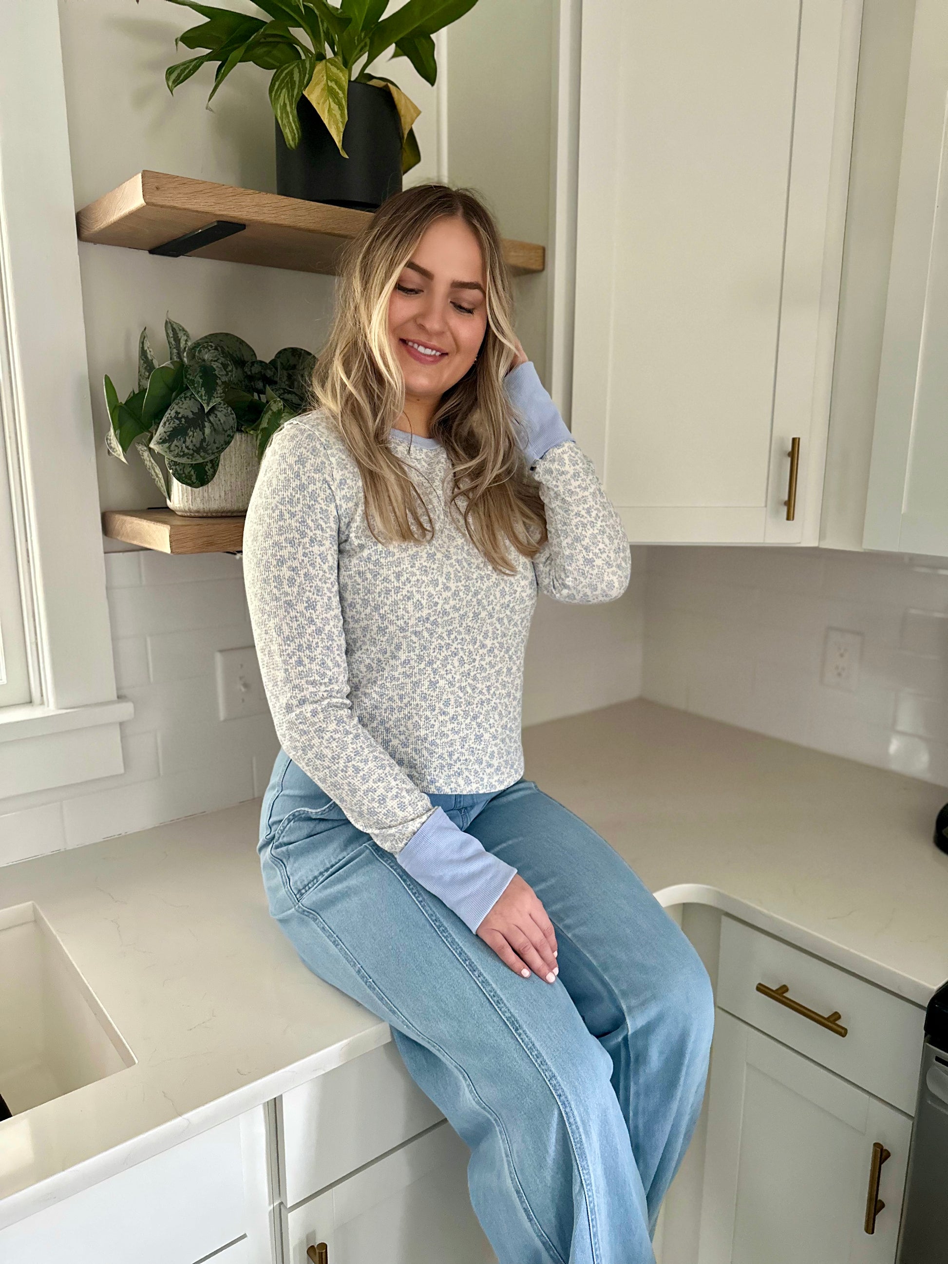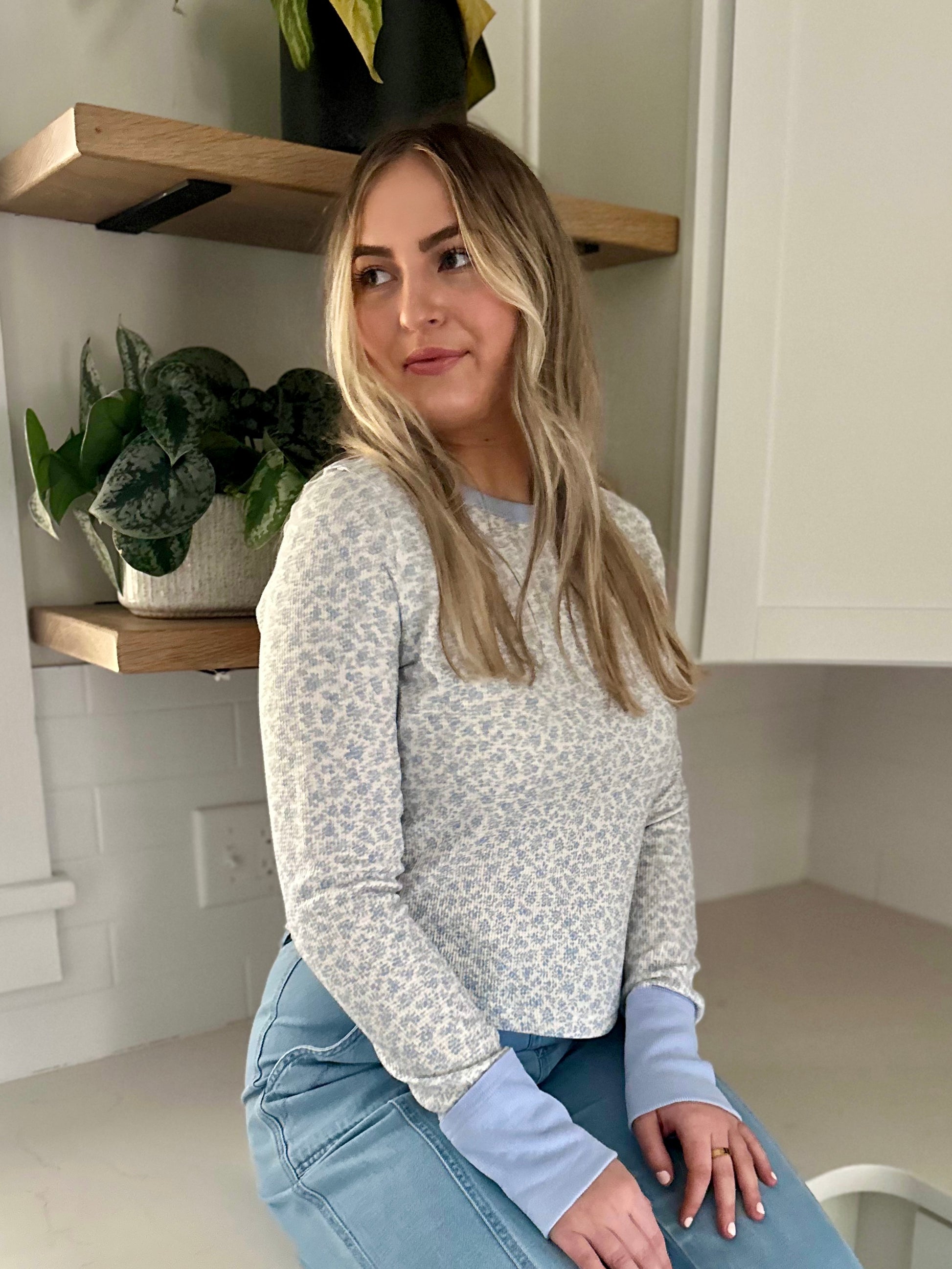 Get ready to embrace comfort and style with our Ithaca Textured Top. This crew neck top features long sleeves, a soft and textured fabric, and a beautiful floral design. With contrast cuffs and a thumb hole detail, this casual top ensures a perfect fit and a touch of fun. Stay cozy and stylish with the Ithaca Textured Top.