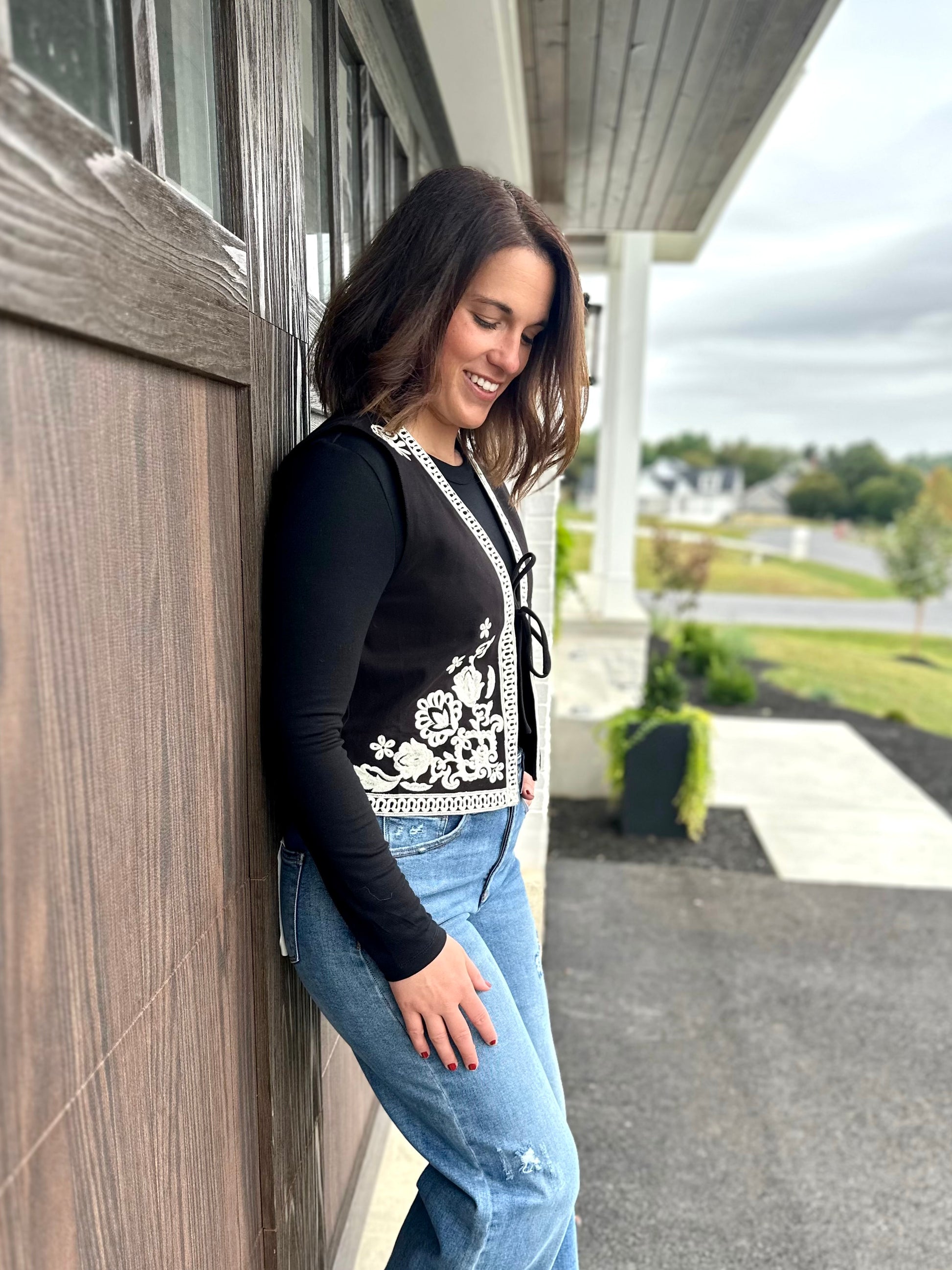 The Londonderry Embroidered Vest is your new boho favorite with a playful twist. Featuring a flattering v-neck and sleeveless cut, it’s crafted with delicate floral embroidery that brings a touch of whimsy. The tie-front detail lets you customize your look, while the layered design adds charming dimension. Fully lined for comfort, this vest effortlessly blends style and ease for your everyday adventures.