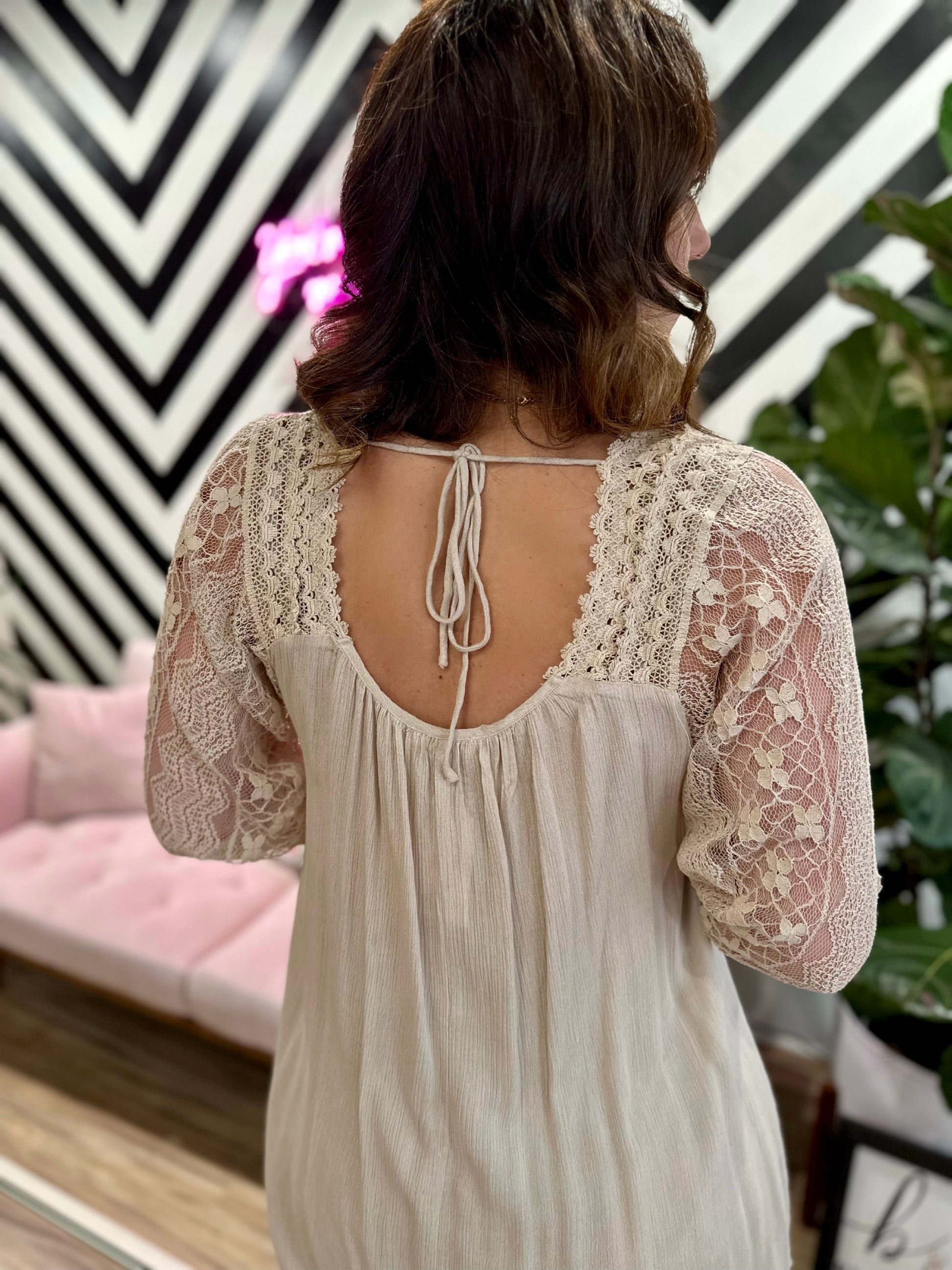 Look stylish and feel comfortable in the Maddie Lace Sleeve Dress. Featuring lace sleeves and pleats, this cute dress will become your go-to for any occasion. The lightweight fabric is perfect for warm weather, making it ideal for all seasons.