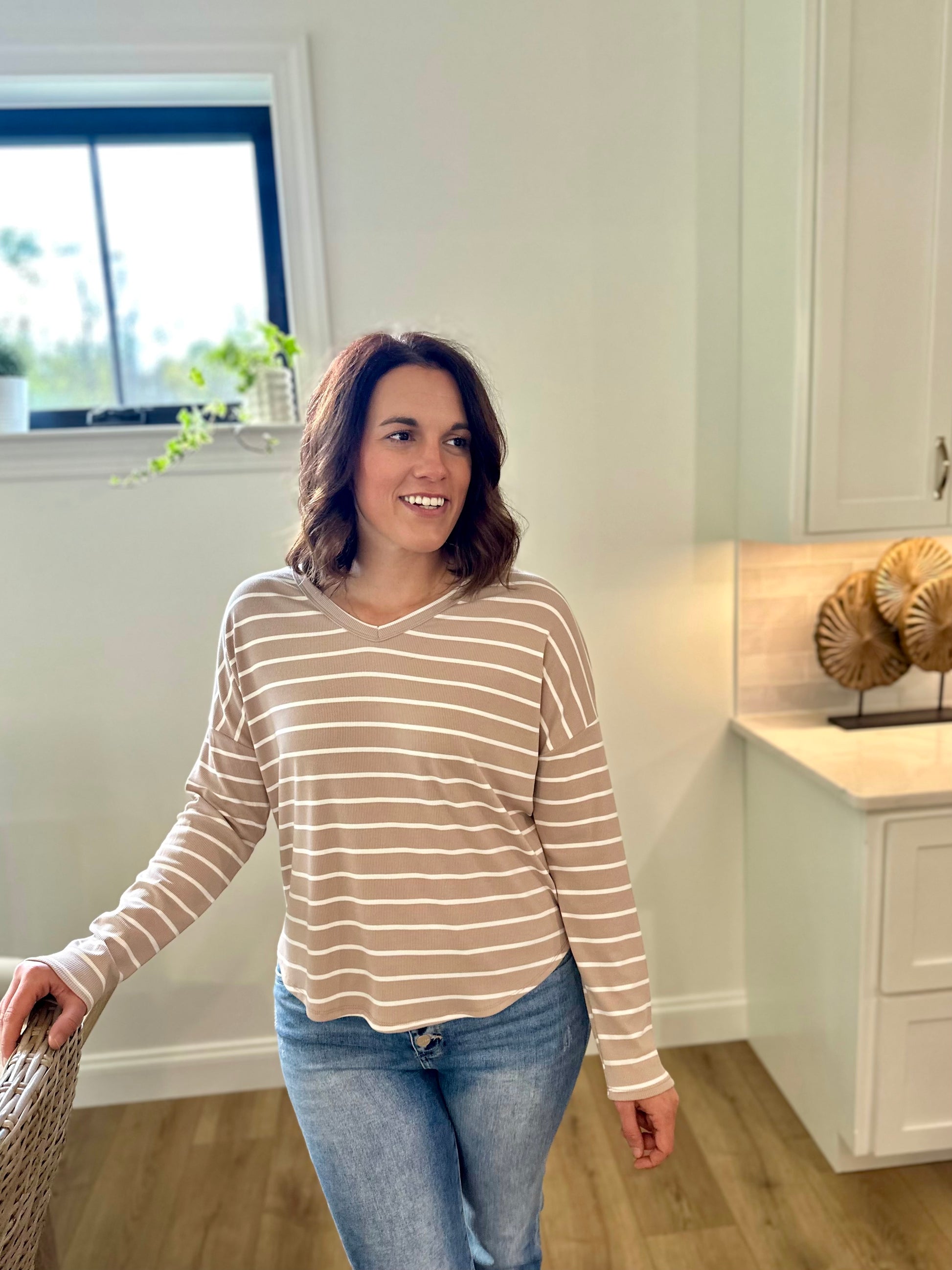 The Monowi Stripe Top brings playful vibes to your casual days with its cozy long sleeves and flattering v-neck. Its stretchy fabric and relaxed fit move with you, delivering all-day comfort without sacrificing style. Perfect for layering or wearing solo, this striped favorite turns simple into effortlessly fun.