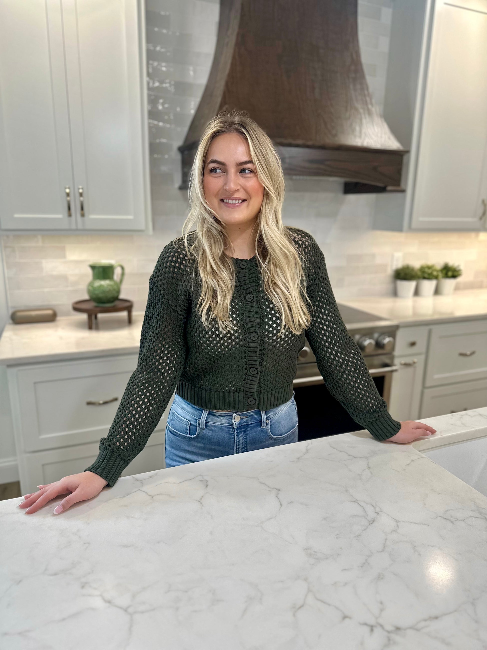 Rock Hill Knit Cardigan Sweater Elevate your layering game with this charming crochet cardigan. The delicate button-front design and soft, feminine silhouette make it an instant favorite for effortless styling. Crafted with meticulous crochet detailing, this crew neck sweater drapes beautifully over everything from fitted tees to slip dresses, adding texture and warmth without bulk. Its versatile appeal makes it perfect for transitional seasons or as a sophisticated layer year-round. Invest in a piece that combines tim
