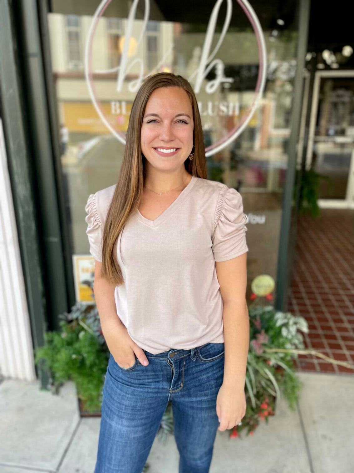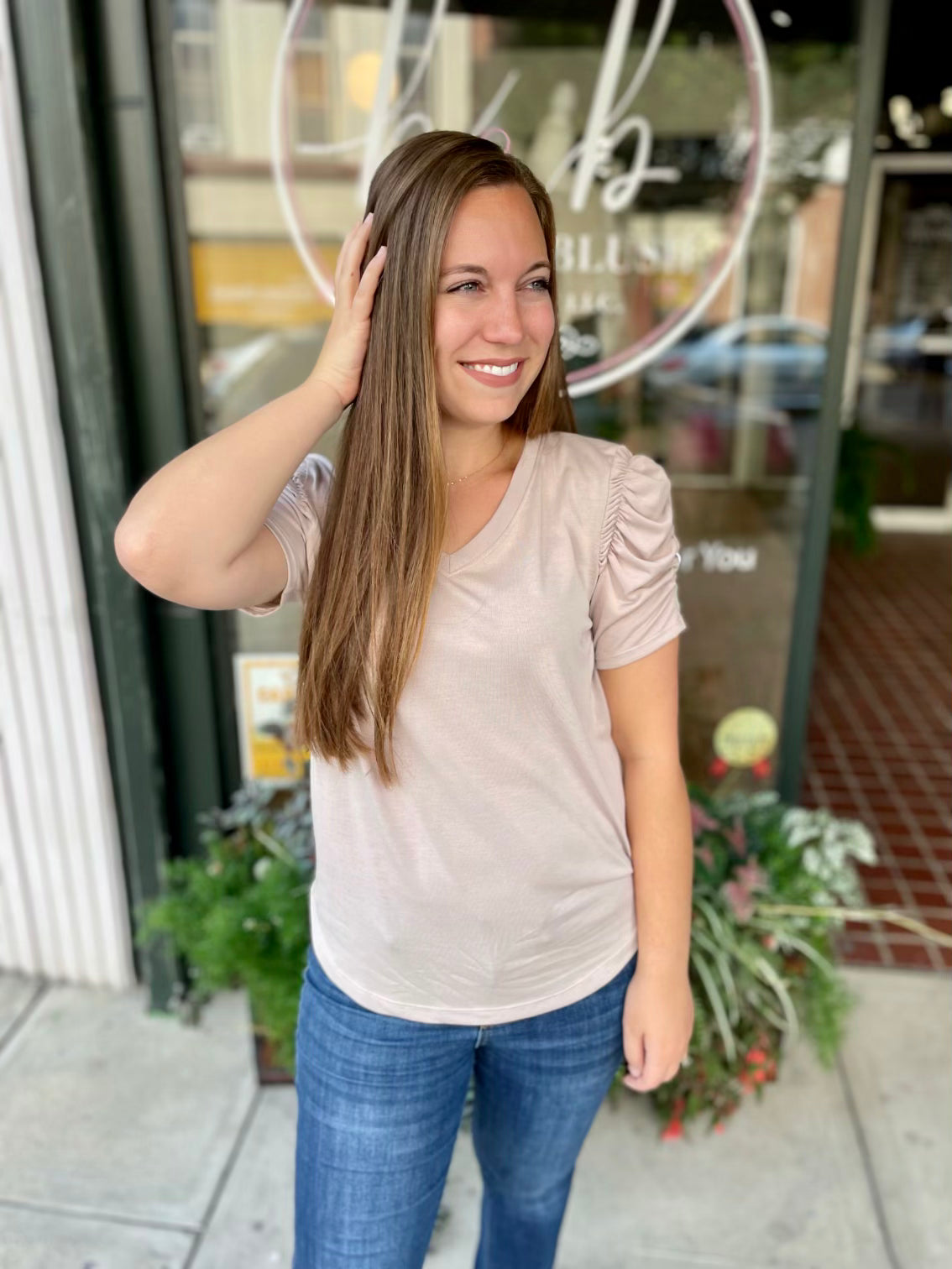 The Stuck on me+You top is the perfect piece for any wardrobe. Its taupe color is classic and sophisticated, while its gathered sleeves, flattering fit, and v-neck create a look that is both timeless and modern. Perfect for any season and ideal for the office, this top is sure to become a staple in your wardrobe.