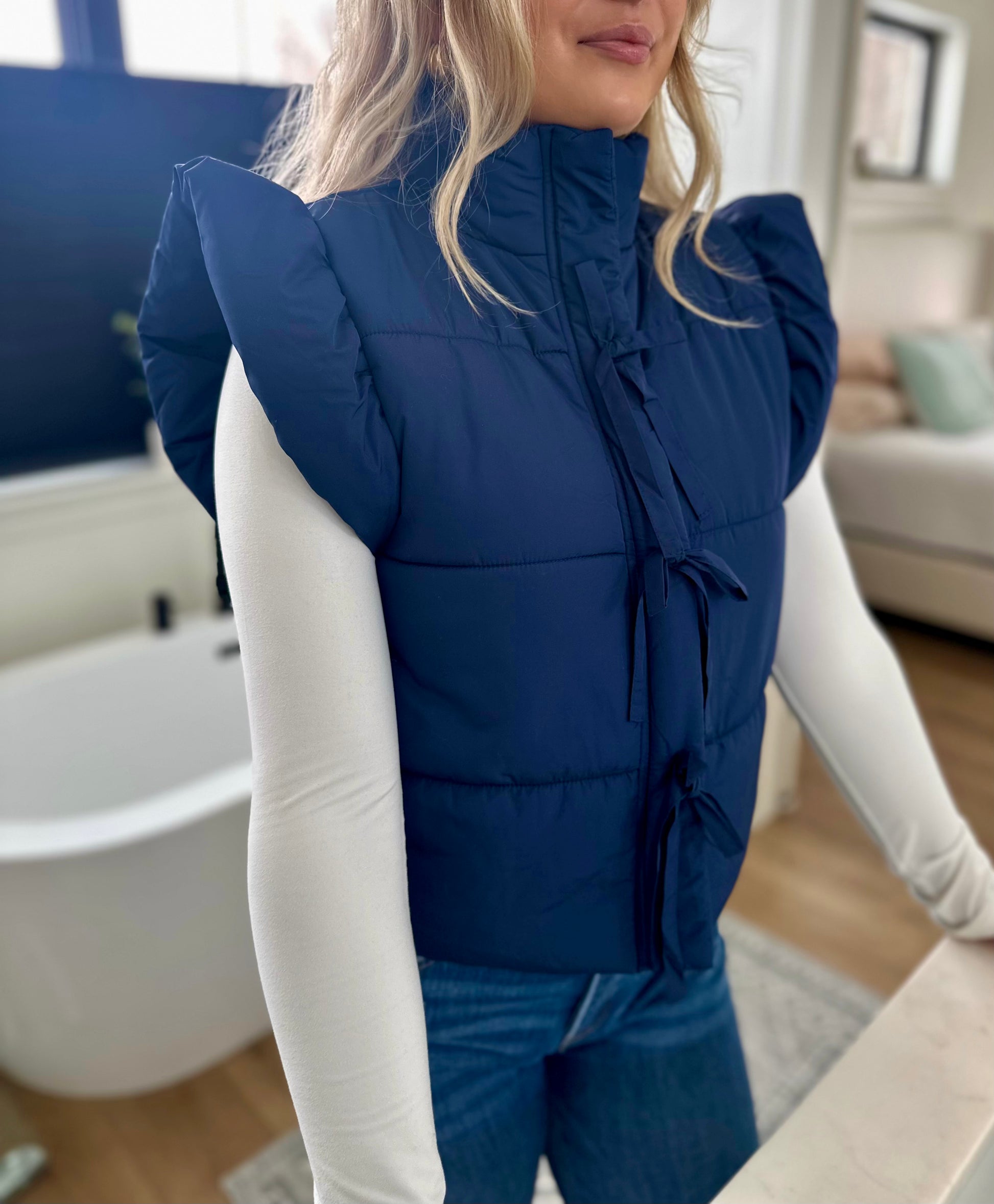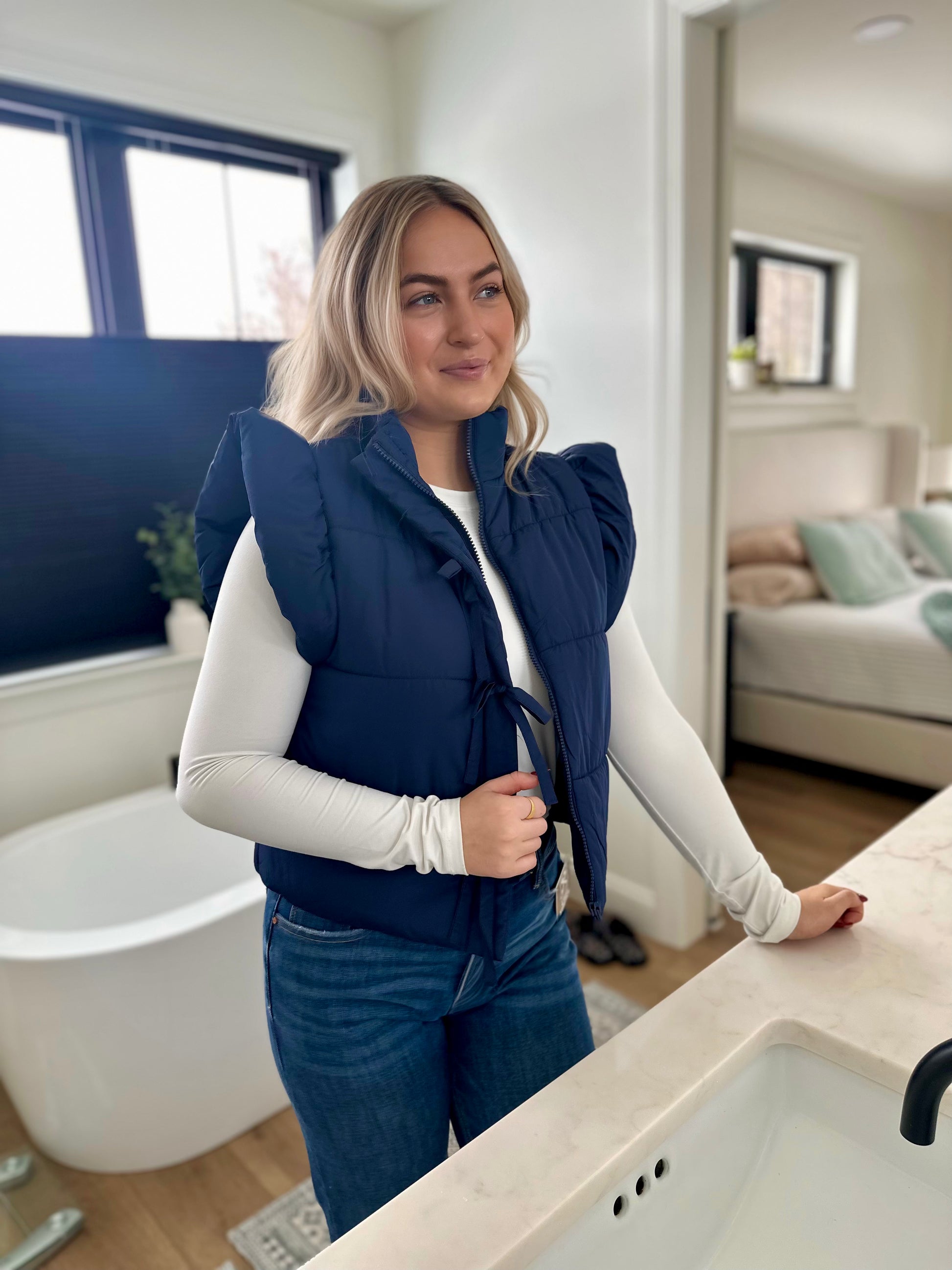 Elevate your layering game with the Unionville Bow Vest—a feminine take on classic puffer style. This sleeveless essential features a flattering mock neck, charming bow detail at the neckline, and flutter sleeves that add movement and grace. The convenient zip-up front makes it easy to adjust your warmth throughout the day. Perfect for pairing over your favorite tees or dresses, this versatile vest combines cozy comfort with undeniable style. Whether you're running errands or meeting friends, you'll love how effortlessly chic you look.
